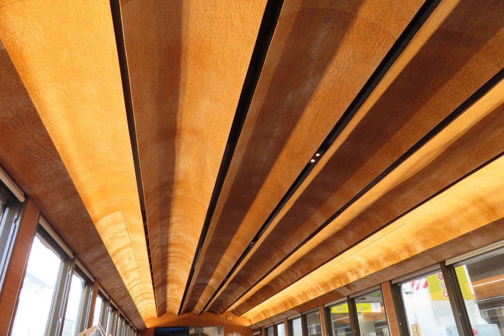 私達の席がある2両目の天井は柿渋和紙
